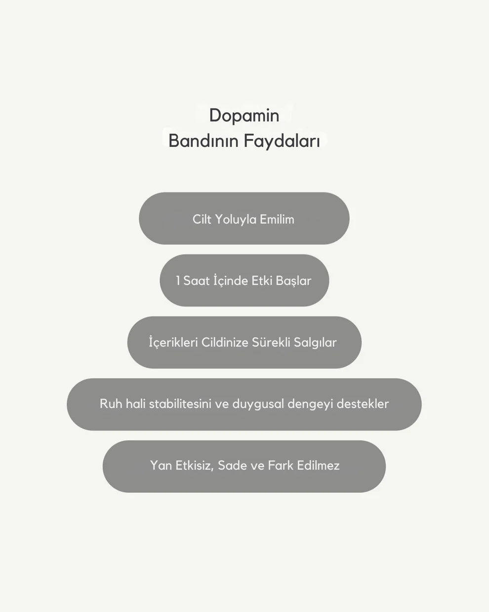Her bir Dopamin Bandı, 8 saate kadar dengeli ve sürekli destek sağlar. Bandı temiz ve kuru cildinize uygulamanız yeterlidir; gün boyu faydalarını hissedebilirsiniz.
